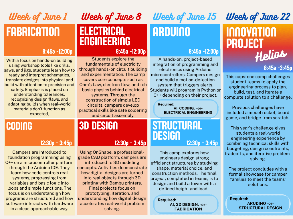 Each session culminates in a comprehensive final project, with successive sessions building on previously learned concepts and skills. Campers will apply iterative design processes, manage constraints, and produce tangible engineering takeaways that reflect their growth and effort throughout the week.